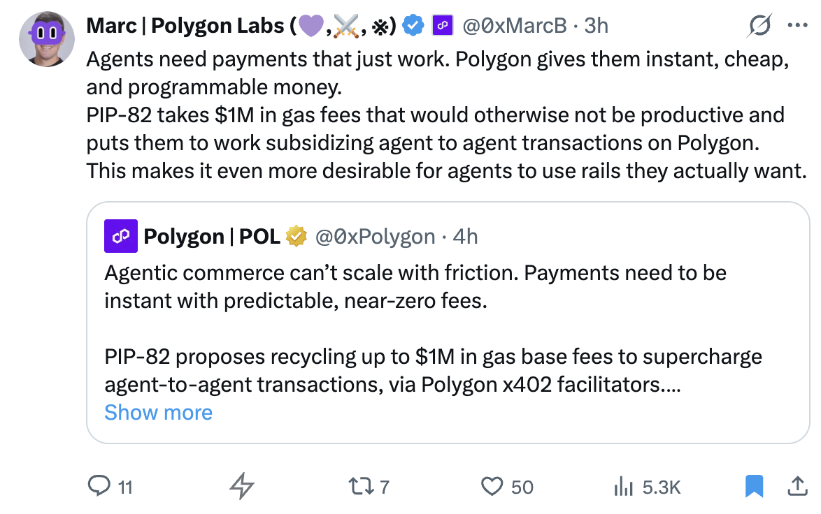 Polygon’s “PIP-82: Agentic Commerce Gas Program” forum discussion