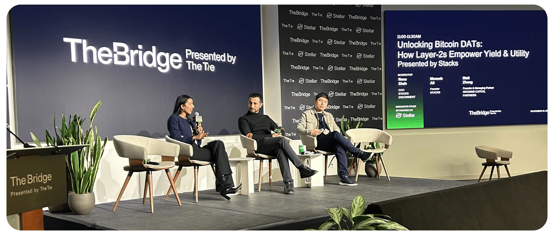 Rena, Muneeb, and Matt Zhang (Hivemind Capital) spoke about how Stacks is moving Bitcoin from sitting idle to earning onchain yield and powering a real Bitcoin economy.